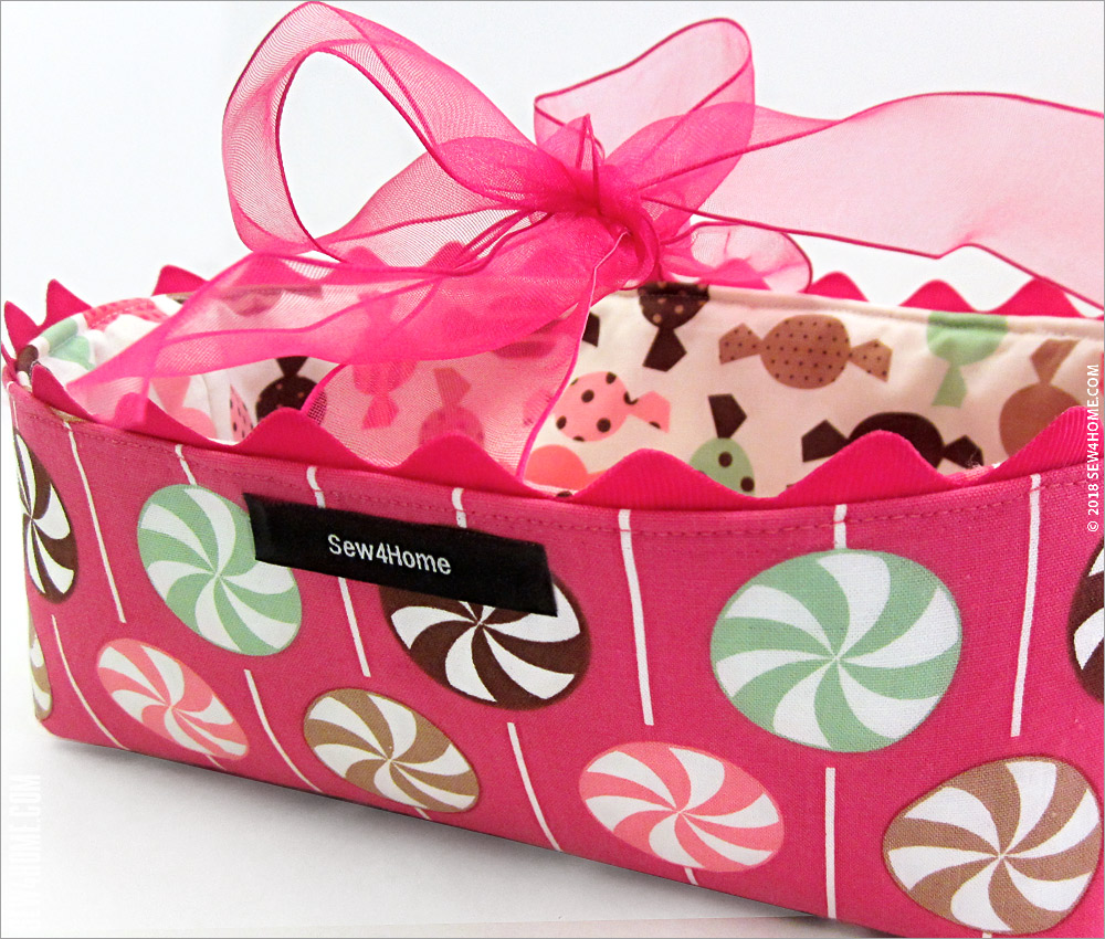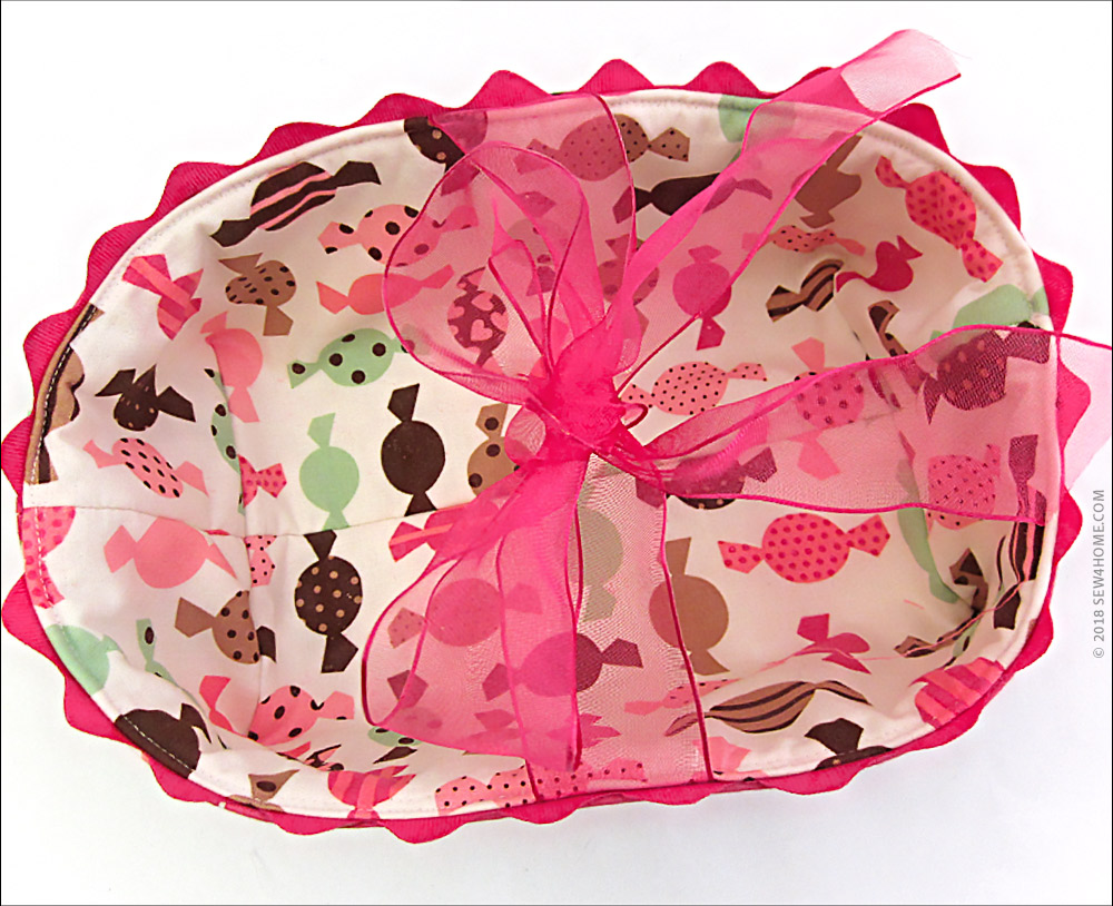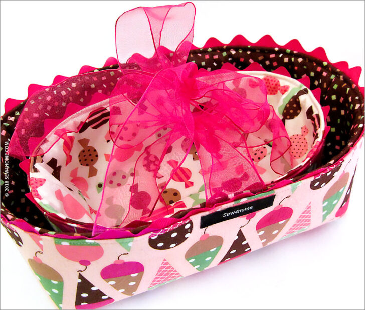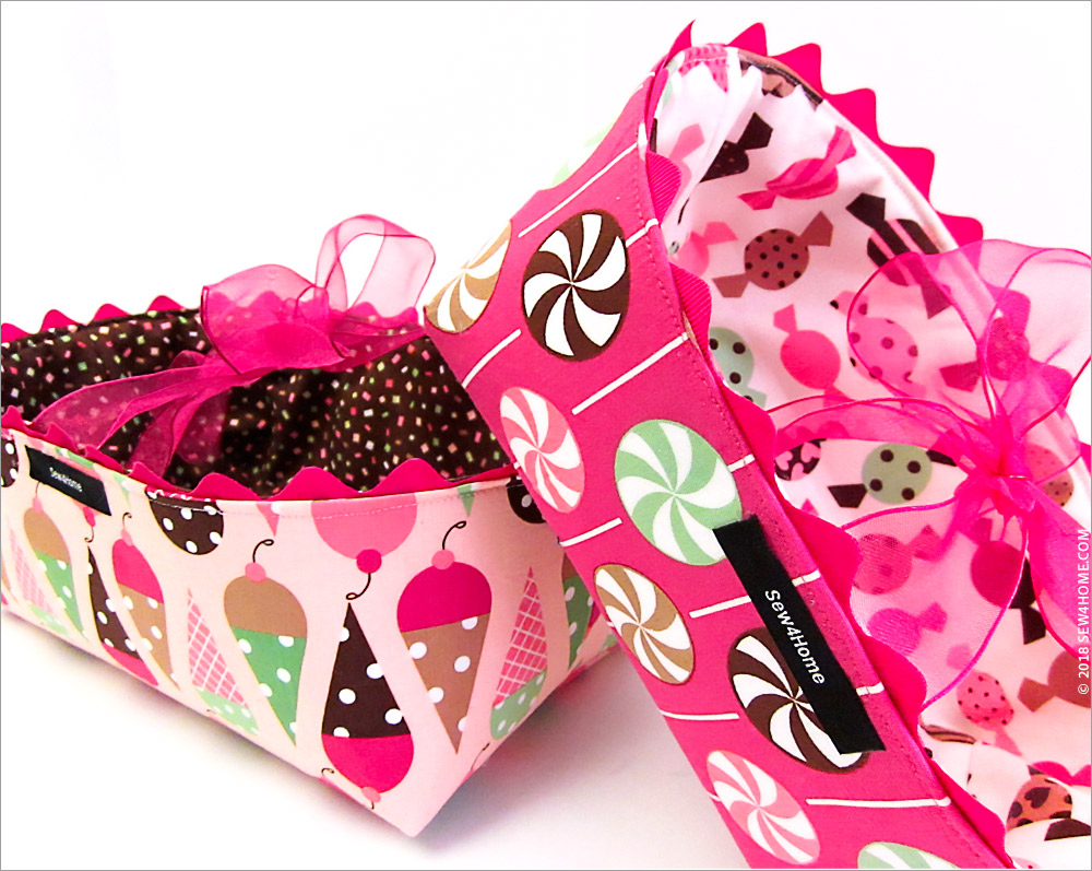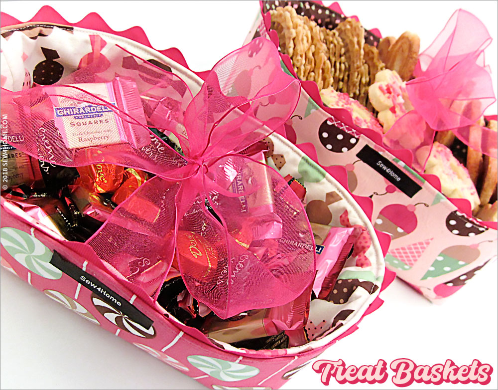 Sweets for your sweets look even more delicious in these beautiful baskets. Yes, I realize our photos do not feature homemade goodies, but I don’t want to hear any grief about that… no one says sewing and culinary creativity must go hand-in-hand.