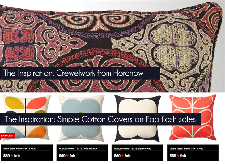 In our pillow perusal over the past weeks, the style we came across most often by far was the simple, square pillow. It’s a style so easy to make, you could almost do it with your eyes closed… if it weren’t for the stitching-over-your-finger part. The main challenges are finding a great fabric, then fussy-cutting that fabric to best showcase one or more dramatic motifs. However, neither of those things is really that much of a challenge. We located one of today’s fabrics at a local chain retailer and the other at a small independent shop. The only difficulty: picking just two favorites from their large selections. Fussy-cutting isn’t hard either; it simply takes a little patience and precision. We have an easy step-by-step tutorial. When a pillow is as basic as these, the insert is more important than ever. The Fairfield Home Elegance™ pillow inserts are our choice for the entire week, and we couldn’t be happier about that. They have a 100% cotton, 300-thread count jacquard cover filled with a special 100% polyester gel fiber. The result is an exceptionally plush textured pillow with a high-end designer look and feel. These are the most elite and luxurious down-alternative pillows available. And, thanks to their super cushy inside, you can get that high-end, karate-choppable look. We used the best quality, brand new components (no stash stealing) and came in under $50 for the large pillow, under $20 for the smaller pillow; pretty slick savings over retail. See our pillow inspiration after the jump.