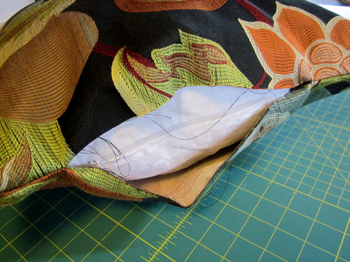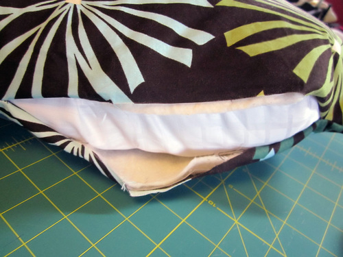 How you prepare your fabric also makes a great deal of difference in a simple square pillow. For today’s samples, we used two very distinct fabrics: one a heavy-weight home décor fabric in a crewel style, the other a standard quilting weight cotton. With heavier fabrics, if you use a premium pillow form, little else needs to be done besides correctly sizing and cutting. If you’re using a lighter weight fabric, consider doing what we often do: add a later of batting (as we are doing today) and/or fusible interfacing (as we did with yesterday’s Grommet pillow) to give your fabric more stability and to create a super smooth exterior. If your fabric is especially lightweight or a specialty fabric, you can even add a third lining layer for a super professional finish.