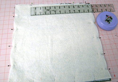 - Make a sandwich with the batting, layering a piece on either side of the fabric pieces. Make sure all the edges of all the layers are flush. Pin in place.
