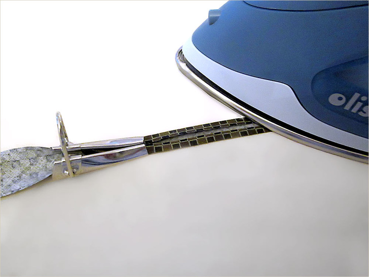 NOTE: In the photo below, we left our ribbon/webbing tales long so you could get a better idea of the layering. As mentioned above, at the female end, fold back and under about 1½”. At the mail end, fold back and under about 3½” – 4″ – trim any excess.