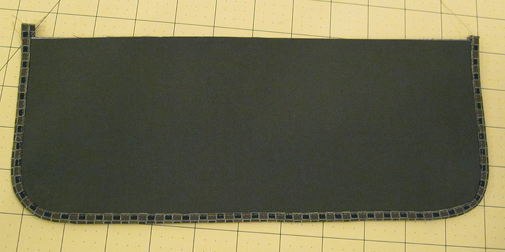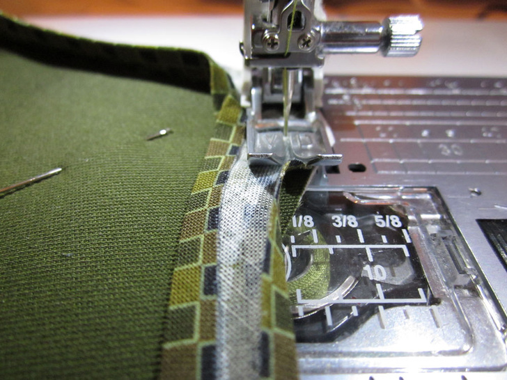 - When stitched in place, fold the bias tape over the raw edge to the lining side of the flap. The folded edge should cover your first line of stitching. Pin in place.