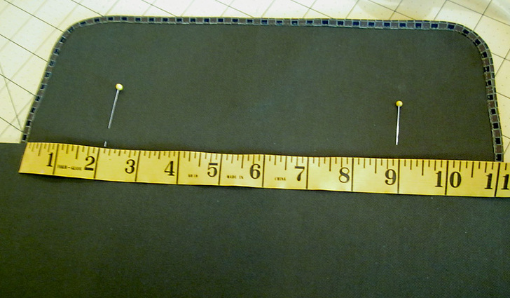- On the right side, measure and mark along the flap seam for the handle placement. The pins should be 2″ in from each finished edge of the flap and 7″ apart, centered on the flap seam.
