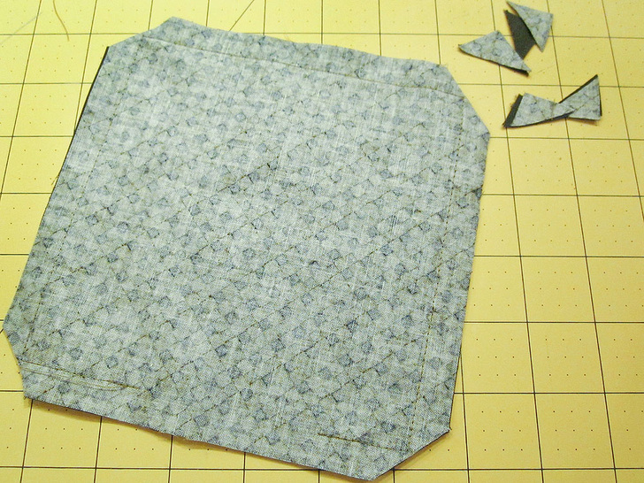 - Using a ½” seam allowance, stitch the pocket seams, remembering to pivot at all the corners and to lock your seam at either side of the 2″ opening left for turning. Clip the corners.