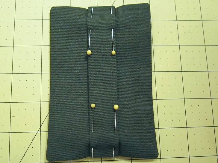 - With the flap up and out of the way, place the two exterior case pieces right sides together, matching the raw edges. Pin in place along the bottom edge only.