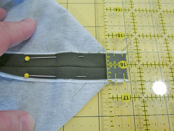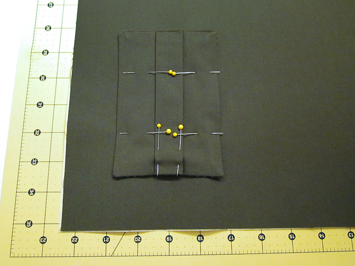 - Create a 1″ box pleat at the center of the pocket. Pin in place. The pocket should now measure approximately 3½” wide.