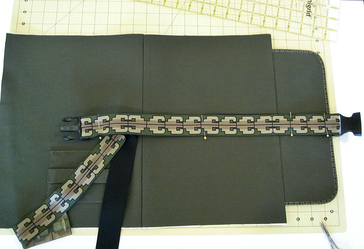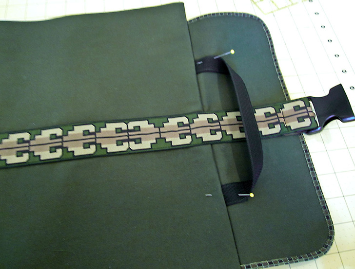 - Place the strap along this center line. Position the female end of the buckle so it just clears the edge of the flap as shown in the photo below. If you measured correctly above, you should have 20″ from the base of the female end of the buckle to where the ribbon/webbing folds back through the male end of the buckle. Pin in place.