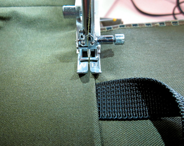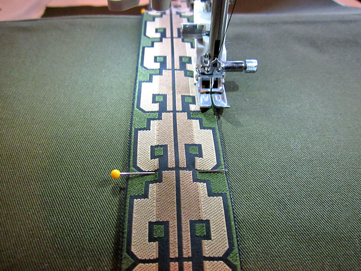 - Edgestitch the ribbon/webbing in place. We lengthened our stitch and use a black thread for a bit of decorative contrast against the ribbon.