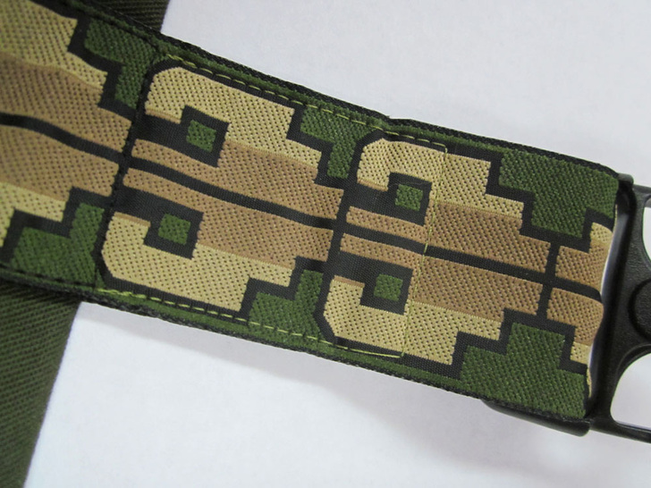- Pull the 3″ free end away from the fabric so you can create a final “box” of edgestitching to keep these layers together. The bottom of our box starts and stops at the horizontal line of the previous edgestitching. The sides of the box are perfectly in line with the previous edgestitching, and the top of the box should be as close as you can get it to the buckle (just as you did on the female end). We were able to get within about 1″. We switched to an olive green thread for this final box for a best match against just the ribbon.
