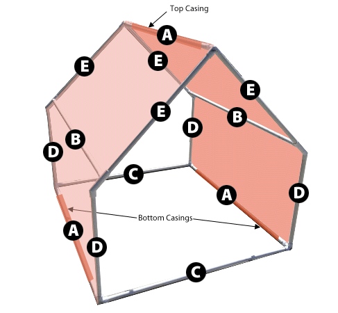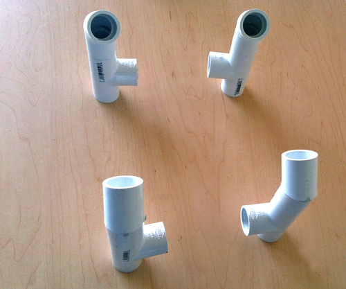 NOTE: PVC parts are designed to fit tightly in normal use. Since we need our frame to come apart in three places to slip on the fabric, and to disassemble completely for storage, we want it to come apart easily. We found it helpful to slightly lubricate the ends of the pipe with a lip balm or vaseline. No need to overdo it, just a light rubbing will make it easier to disassemble. - First assemble the angle fittings (which join pipes D and E). These parts will remain joined, so there is no need to lube them or to plan to take them apart.