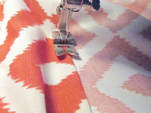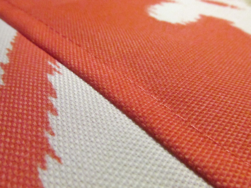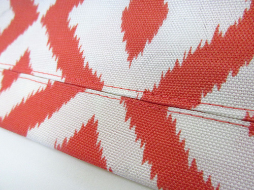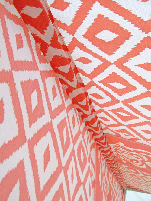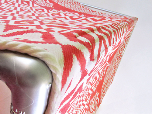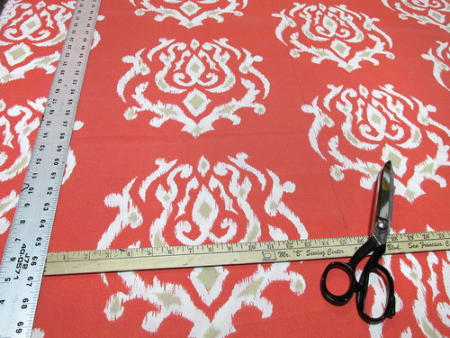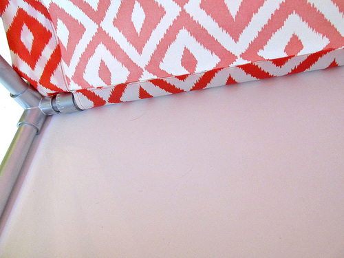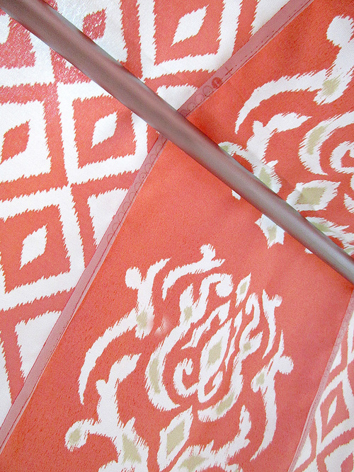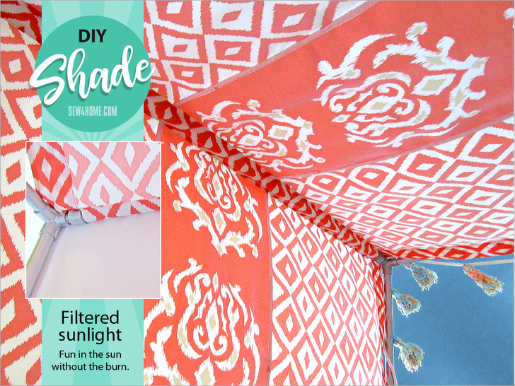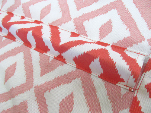 This project is a great excuse for using outdoor fabrics with their classic big, bold motifs! This type of fabric also has the ideal weight: heavy enough to form the structure of the tent, but still light enough to gently billow in the summer breeze. We selected two coordinating fabrics in a rich coral with Ikat style designs. Choose your own combination from the huge selection of indoor/outdoor fabrics traditionally available this time of year.