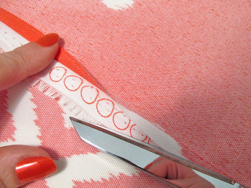 - On one side, place a casing strip parallel with the hem and drawn line. The bottom folded edge of the casing should butt right against the top of the hem.