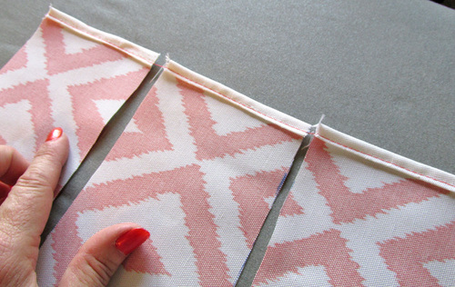 - As above, push up the casing so it forms a tunnel and align its opposite folded edge against the remaining drawn line. Edgestitch in place, staying close to the casing’s folded edge. On all three casings, both ends are unstitched and open to accept the PVC pipe.