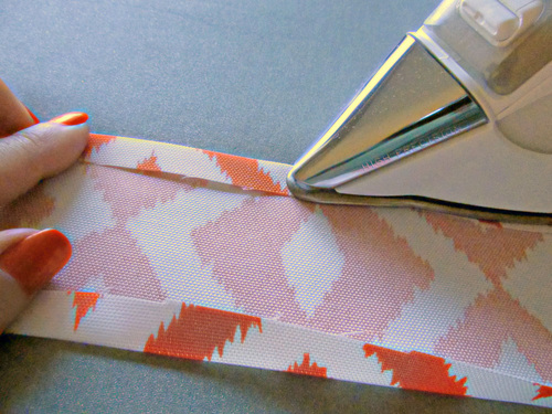 - Create a ½” double fold hem along each 4″ end. To do this, fold in the raw edge ¼” and press. Then fold an additional ¼”, press again, and pin in place. Stitch the hem in place, staying close to the inner fold. We chain stitched our strips for faster hemming.