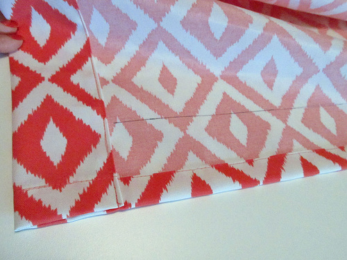 - Along both shorter sides, draw a line 2″ up from the top of the hem (the 1½” hem). This parallel line should run the length of both sides, but should not cross over the wider hems.