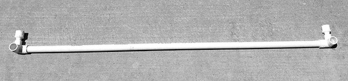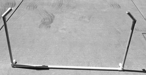 - Set the corners on the ground so they form a 90˚ angle with one opening facing up. Slip a corner onto each end of the Part C pipe as shown below.