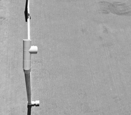 - Place one of the top ends of the tee (Part H) onto the other end of the pipe and tap it on a hard surface. There should be very little or no space between the fittings. The pipe segment is now buried within the two fittings. Twist the tee (Part H) so the outlet side of it is facing away from the assembled angle.