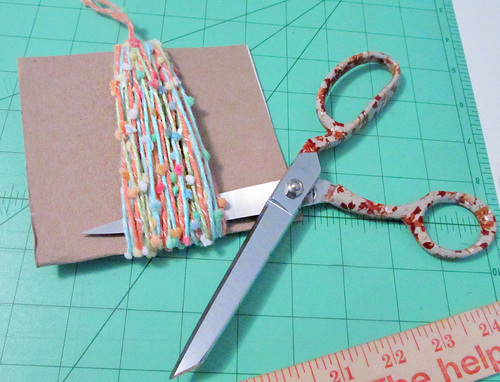 - Cut EIGHTEEN 12″ lengths of yarn for the hanging ties and EIGHTEEN 36″ lengths of yarn to wrap the tassels.