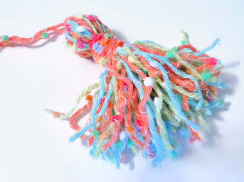 - We used SIX 135″ lengths of each color of yarn for a total of EIGHTEEN 135″ lengths of yarn. Each length is wrapped around the cardboard form about 15 times. The colors were wrapped at random so they mixed nicely. One length was knotted to the next to form a continuous wrap. Again, you can adjust the how fluffy the tassels add by adding or removing yarn.