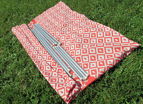 - Fold up the tent into quarters and lay the pipes on top of the folded fabric.
