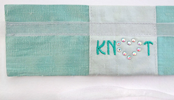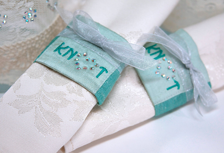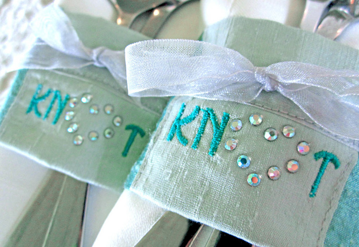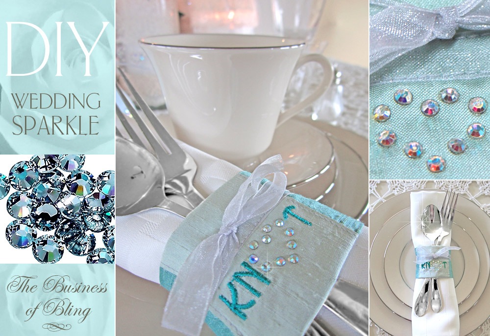 How to set a beautiful table without breaking the bank is always a wedding challenge. Our “tie the knot” napkin wraps give plain (aka – inexpensive) linens and flatware the perfect dash of glittering style. They are super fast and easy, in part because we show you some clever cutting and stitching tricks to set-up for “assembly line” sewing. You can make 48 wraps from just 1½ yards of fabric! The Artistic integrated system of crystals, software, cutters and presses is a perfect match for projects-in-multiples. Once you make one template, you can use it over and over to create an identical design on each wrap. An Etsy seller, for example, could create several generic designs, such as our little heart outline, then let the bride choose between one of these stock designs or a custom monogram. She could also specify the two fabric colors and the ribbon color to match her wedding theme.