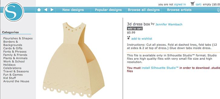 Templates for all kinds of specialty flat and 3-D shapes are readily available online. Since we were using the Silhouette cutter, we turned to the Silhouette shopping site to find our adorable wedding gown template. It was only 99 cents! When you purchase a Cameo digital cutter from an authorized Artistic dealer, it comes with a free $25 download card to the Silhouette shopping site. That’s a lot of .99 templates!