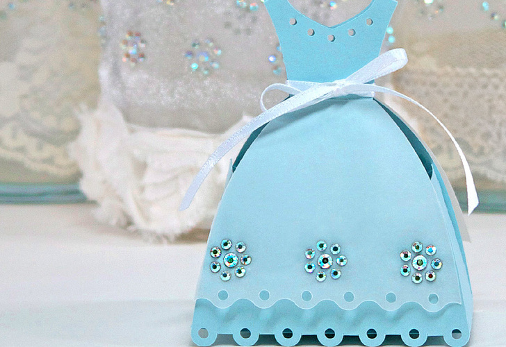 As purchased, the 3-D dress box was quite small. We re-sized it within the software to fit a full size 8½” x 11 sheet of pale aqua cardstock. We inserted vellum into our digital cutter to cut out the overskirt/apron rather than using the piece of matching aqua cardstock. Since this overskirt was the piece onto which we wanted to adhere the crystals, we felt the sheer vellum was much prettier and mimicked the look of our pretty Flower Girl Overskirt.