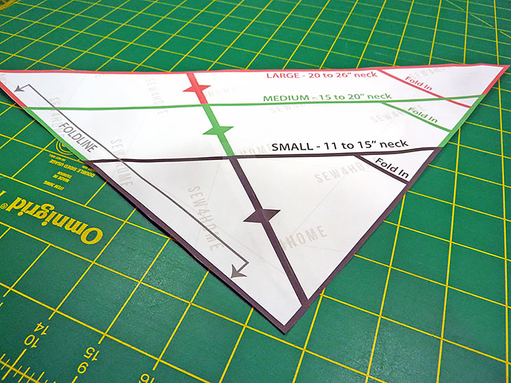 As mentioned above, printing and cutting the pattern is the best way to visualize and confirm the size needed for your dog. Our sizing was based on standard dog collar neck measurements: 11” – 15” for Small, 15” – 20” for Medium, and 20” – 26” for Large. Our samples were both Medium and finished at approximately 12½” wide (across the widest point along the top) x 8” high (from the point of the triangle to the top of the casing).