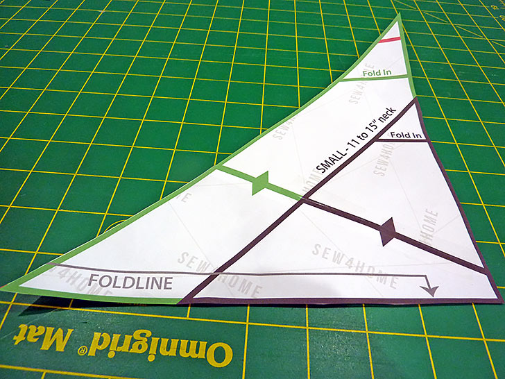 - Find the original paper pattern. Along the right edge of the paper pattern you will find a “Fold In” marking for each of the three sizes. Fold the paper pattern along this line.