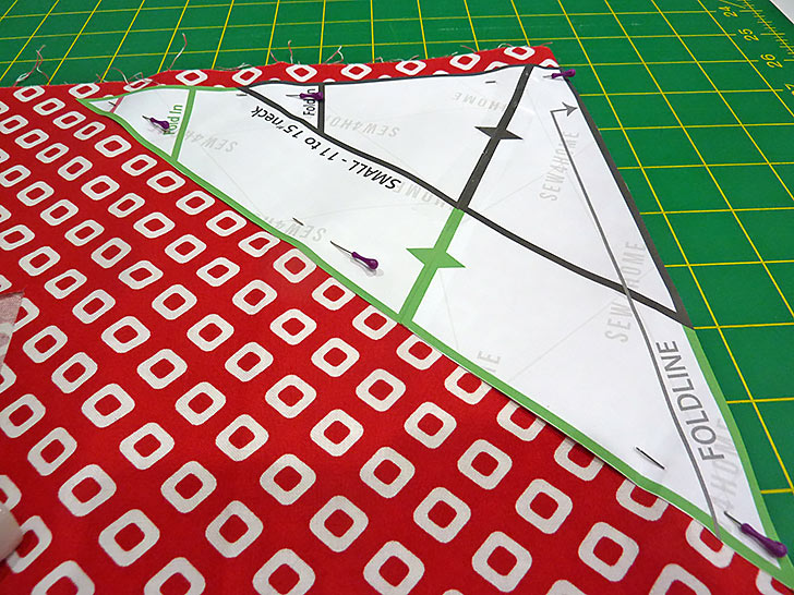 - Remove the paper pattern and edgestitch along the all sides of the folded-in triangle (on each side of the bandana).We started at the seam and stitched all around with a ¼” seam allowance.