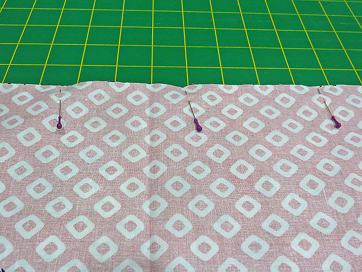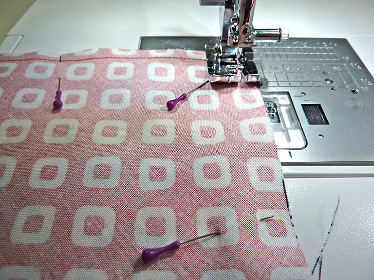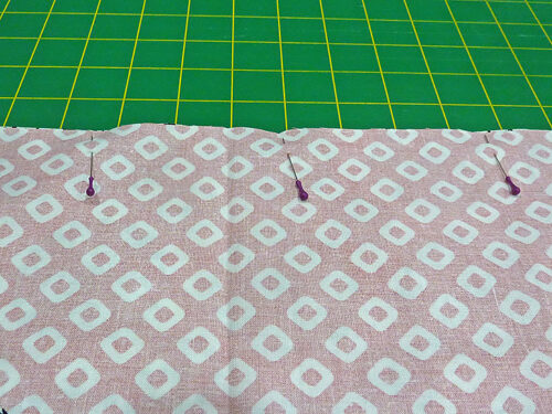 NOTE: If you feel your fabric is one that would be especially prone to fraying or raveling after laundering, you can opt to use a line of seam sealant along the raw edges or re-set your stitch to a tiny zig zag. We opted for a standard straight stitch. - Fold the panel along its center seam, bringing the two halves of the diamond right sides together, forming a triangle shape with the center seam along the top edge. Making sure the diagonal sides of the triangle are flush, pin along both these sides from just below the folded-in casing to the point of the triangle.