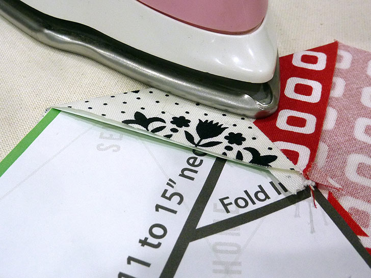 - Align the folded paper pattern along the center seam and fold in each side point so it is an exact match to the folded paper pattern point. Press well.