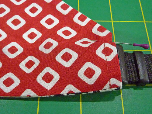 You’ll make the main shape of the bandana first, finishing what will be the open ends of the casing. Then, using your own collar, you’ll determine the final width of the casing. We show you all the steps below, and it’s very easy to insure the casing will be big enough for the collar’s buckle but not so big as to cause the bandana to slip too much.
