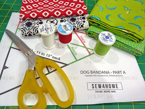 - TWO different scraps or up to ⅓ yard cuts of 44″+ wide quilting cotton or similar: we recommend printing and assembling the pattern, cutting it to the size to match the measurement of your pup’s neck, and then using this pattern to determine if you have enough of your desired two fabrics – as mentioned, the pattern is designed to be cut on the fold