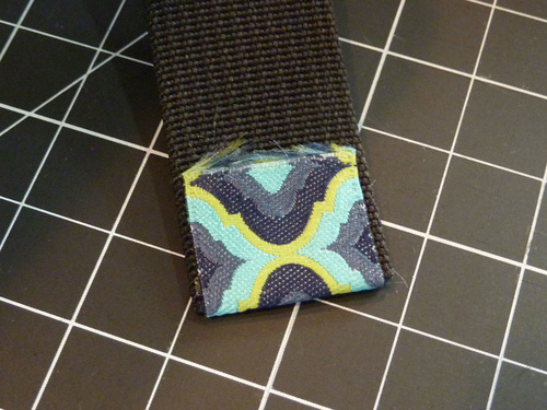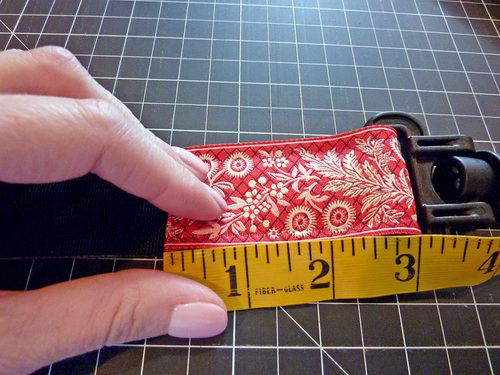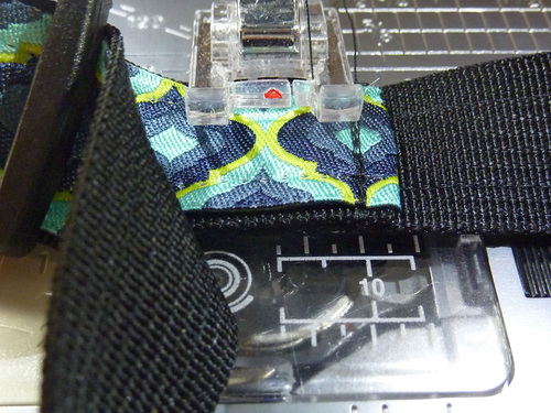 - Use a small piece of the fusible seam tape to adhere the left end of the collar to the back of the adjuster loop and the right end of the collar to the back of the webbing.