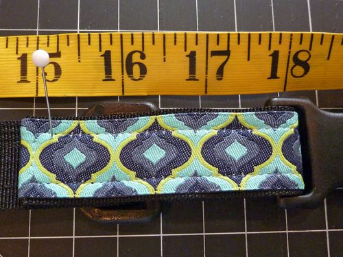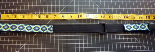 Our collar was sized for our own sweet doggie, Elaine. Her neck measures 20″. The finished collar adjusts from approximately 18″ to 22″, so these instructions would fit a great many pups. To be sure, measure your own dog’s neck. You want the collar to be snug, so it can’t slip off over the dog’s head, but not so tight that you can’t slide your finger easily underneath the collar. Measure your dog’s neck, then add 10″ to give you the 4″ of adjustment from smaller to larger. For example, Elaine’s neck measured 20″, so 20″+ 10″ = 30″.