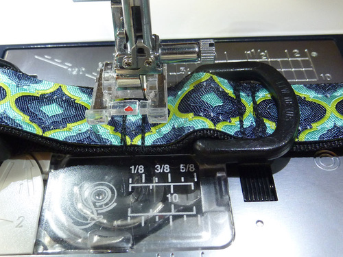 - Then stitch to the other side of the D-ring, getting as close as possible to the ring. This forms a little pocket for the D-ring.