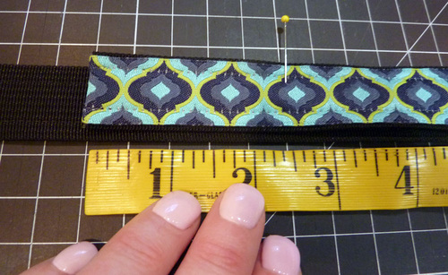 We used invisible thread to stitch the ribbon to the webbing. This is not mandatory, but is a nicer look against the ribbon. For best results, you may need to loosen your upper tension slightly. It’s also a good idea to lengthen your stitch and sew at a slow and even pace. This type of thread does not stretch as well as regular thread and can break more easily under pressure, especially if it accidentally slides off the spool and wraps around the spool pin. Using a spool cap against the spool helps hold it in place on the pin, and again, going slowly and evenly helps the thread to feed correctly off the spool.