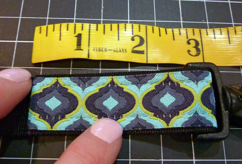 - Feed the opposite end through the swivel hook and fold back 3″. Also adhere this end with a small piece of fusible seam tape.