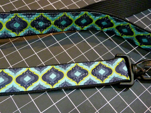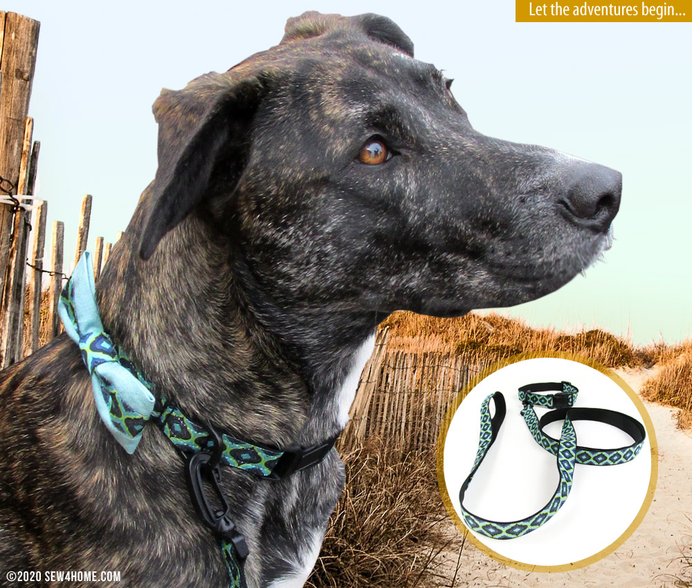 - Stitch the ribbon to the webbing along both sides of the collar and the leash, approximately ¼” from the edge of the webbing. We used our Quarter Inch Seam foot to keep a nice straight line.