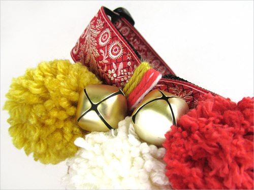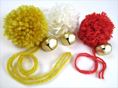 - Leave the final pom tie tails long. Thread a jingle bell onto one of each pair of yarn tails.