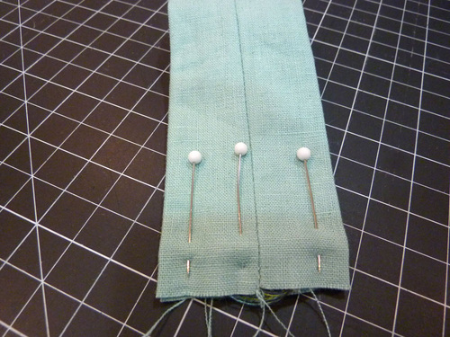 - Place a pin 2½” from the end. Adhere the end in place with a small piece of fusible seam tape.