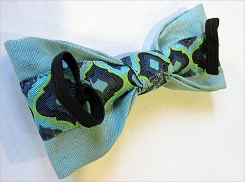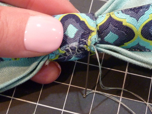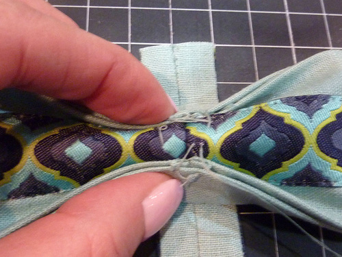- On the back of the bow, securely hand stitch one loop to the outer edge of each bow “wing.”