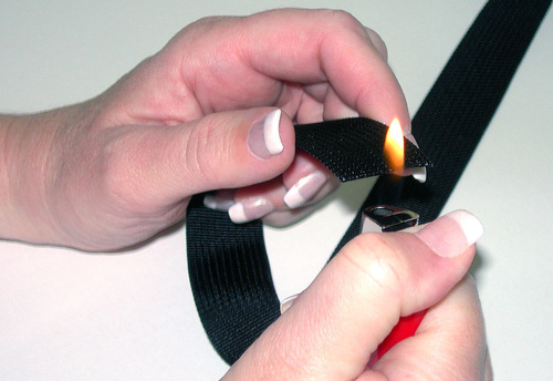 NOTE: You want the ribbon to be an about an inch longer to account for any shrinkage when pressing it onto the webbing and to wrap the ribbon around the ends of the webbing. - Melt all the ends of the webbing to prevent fraying. To do this, simply pass the end of the webbing through the flame of a lighter several times. It doesn’t take much heat.