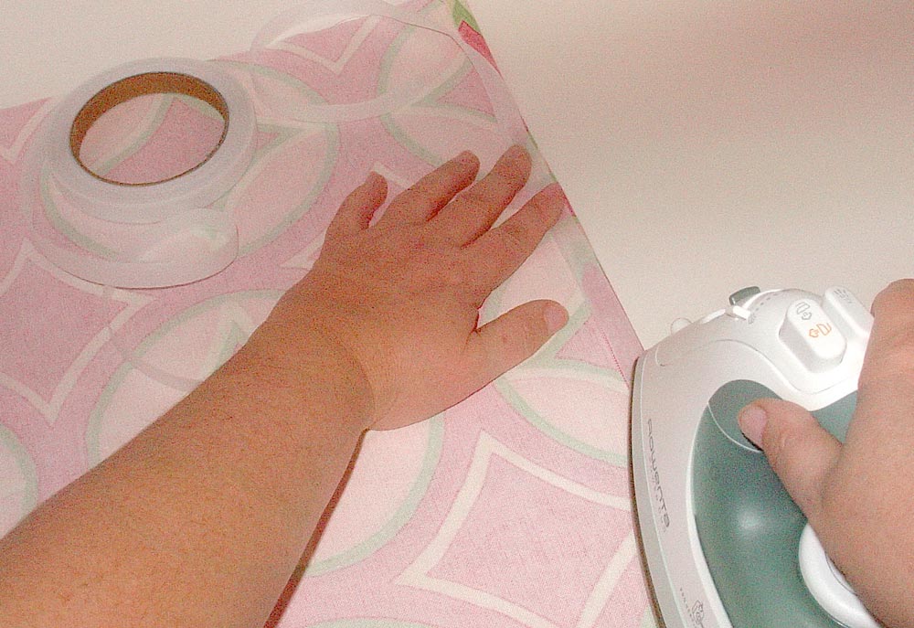 - Fold back the cut edge of one piece of fabric ½” toward the wrong side and press. Place a strip of paper-backed fusible tape, adhesive side down, on this pressed edge, close to the fold. Follow the manufacturer’s instructions for iron temperature and steam setting. Iron along the paper side of the tape. Allow it to cool and then remove the paper.