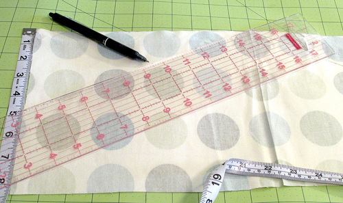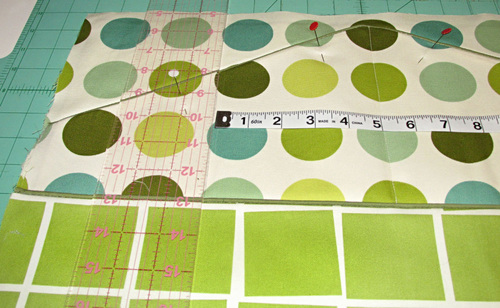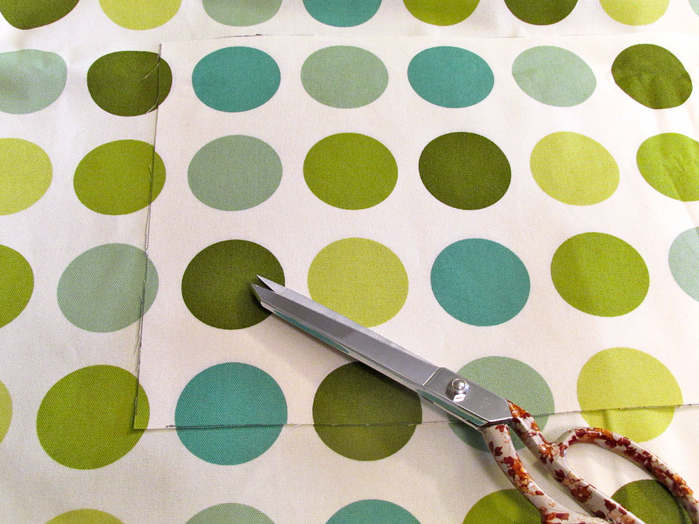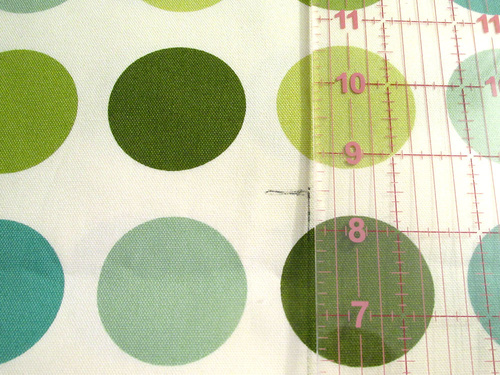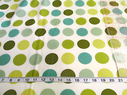 - From the upper exterior fabric (Sevenberry Canvas in Green Dots in our sample) find the exact center of your main motif, measure 10½” to the right of center and 10½” to the left of center, capturing as much of the main motif as possible within the 8½” height of the panel.