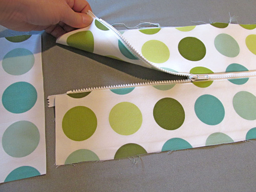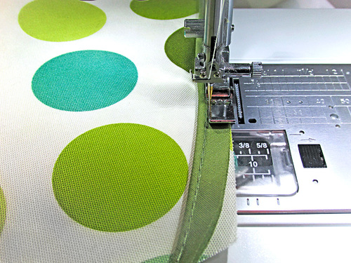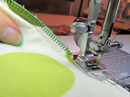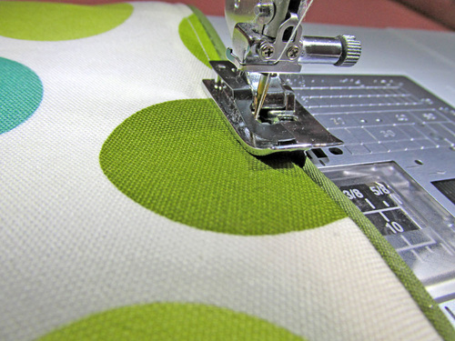- Also just as you did above, use a Zipper foot to baste the piping in place. The raw edge of the piping should be flush with the raw edge of the fabric.