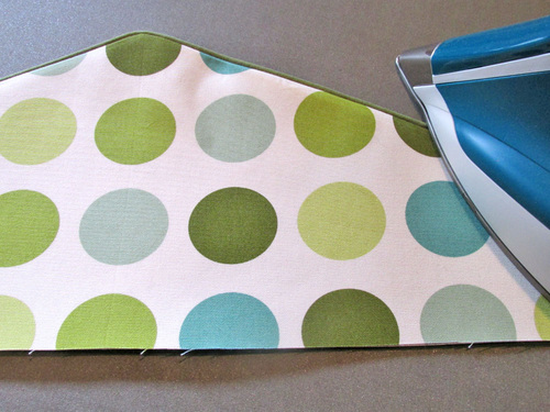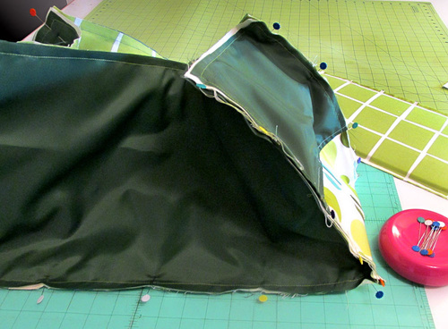 - Turn the panels so they lay wrong sides together and the piping is revealed along the top angled edge. Press lightly. The rip stop is not a fan of high heat, so be careful with your iron’s settings.