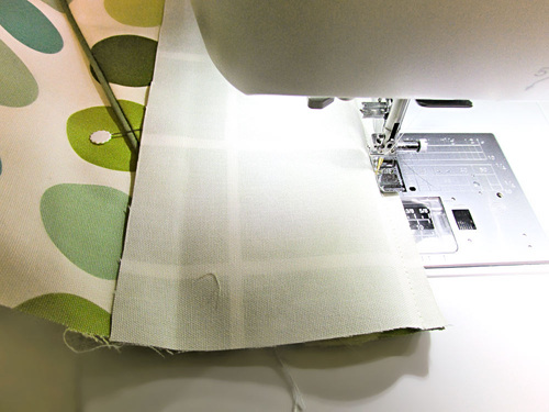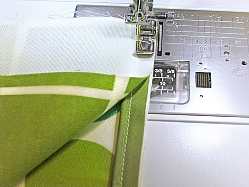 - You are stitching right up to but not on the top and bottom piping. You can actually roll the piping a bit with your finger to get as close as possible with your stitching. If possible, use a lock stitch to secure your seam at the beginning and end. If you do not have this feature, leave the thread tails long and knot them at the back to secure.