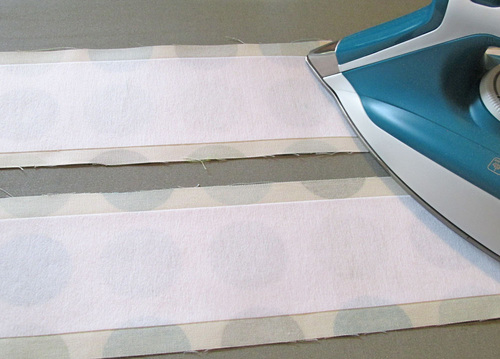 - Following manufacturer’s instructions, fuse the mid-weight interfacing to the wrong side of the 21” x 8½” front panel.